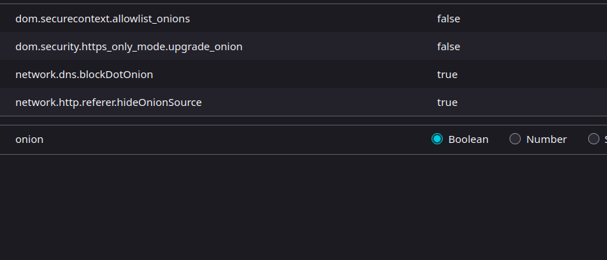 Bonus: Isso não é totalmente seguro, mas caso queira habilitar saidas onion no firefox (tendo o proxy anterior claro), basta ir na barra de navegação, digitar about:config, pesquisar por onion e mudar esses carinhas abaixo:
